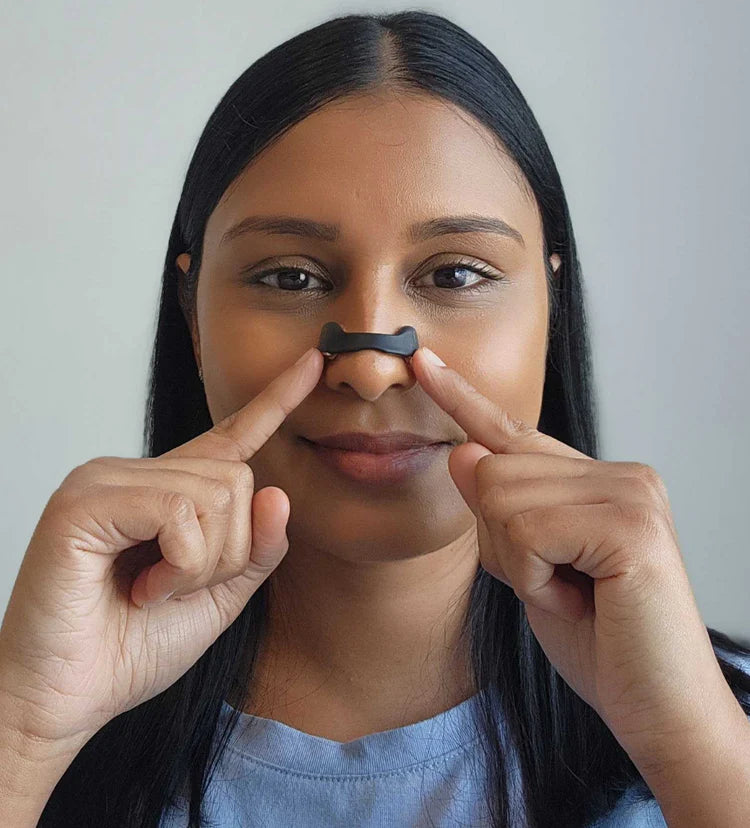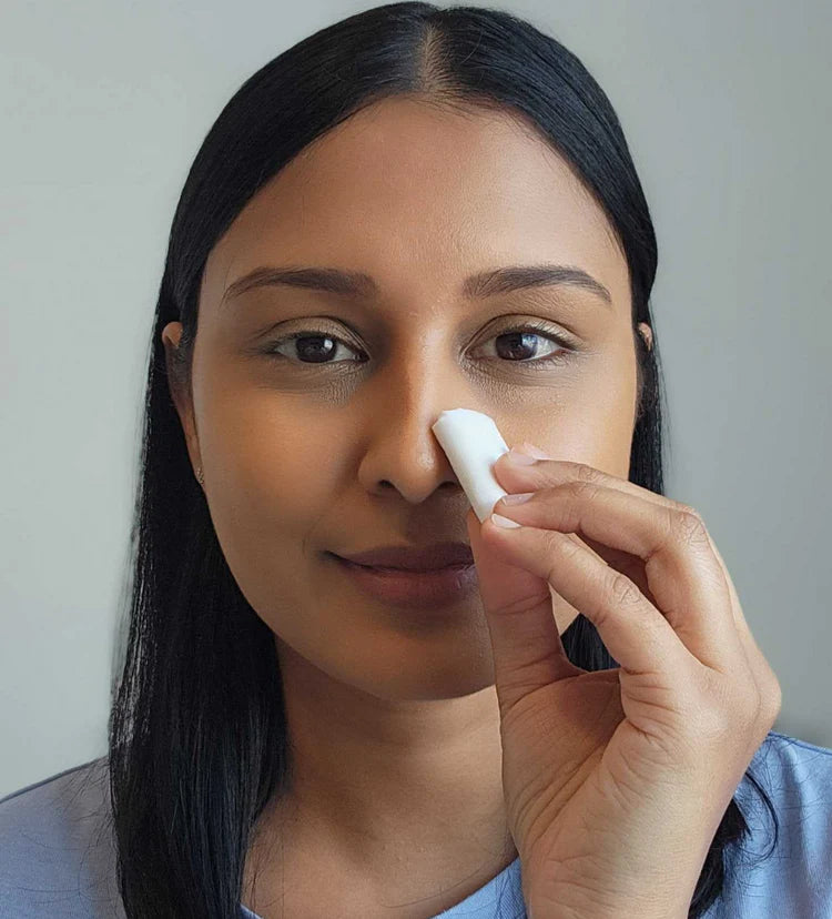 Přilož samolepicí část nad nosní dírky, vycentruj ji a pevně přitiskni. Pro nejlepší přilnavost se jí nedotýkej zbytečně prsty.
